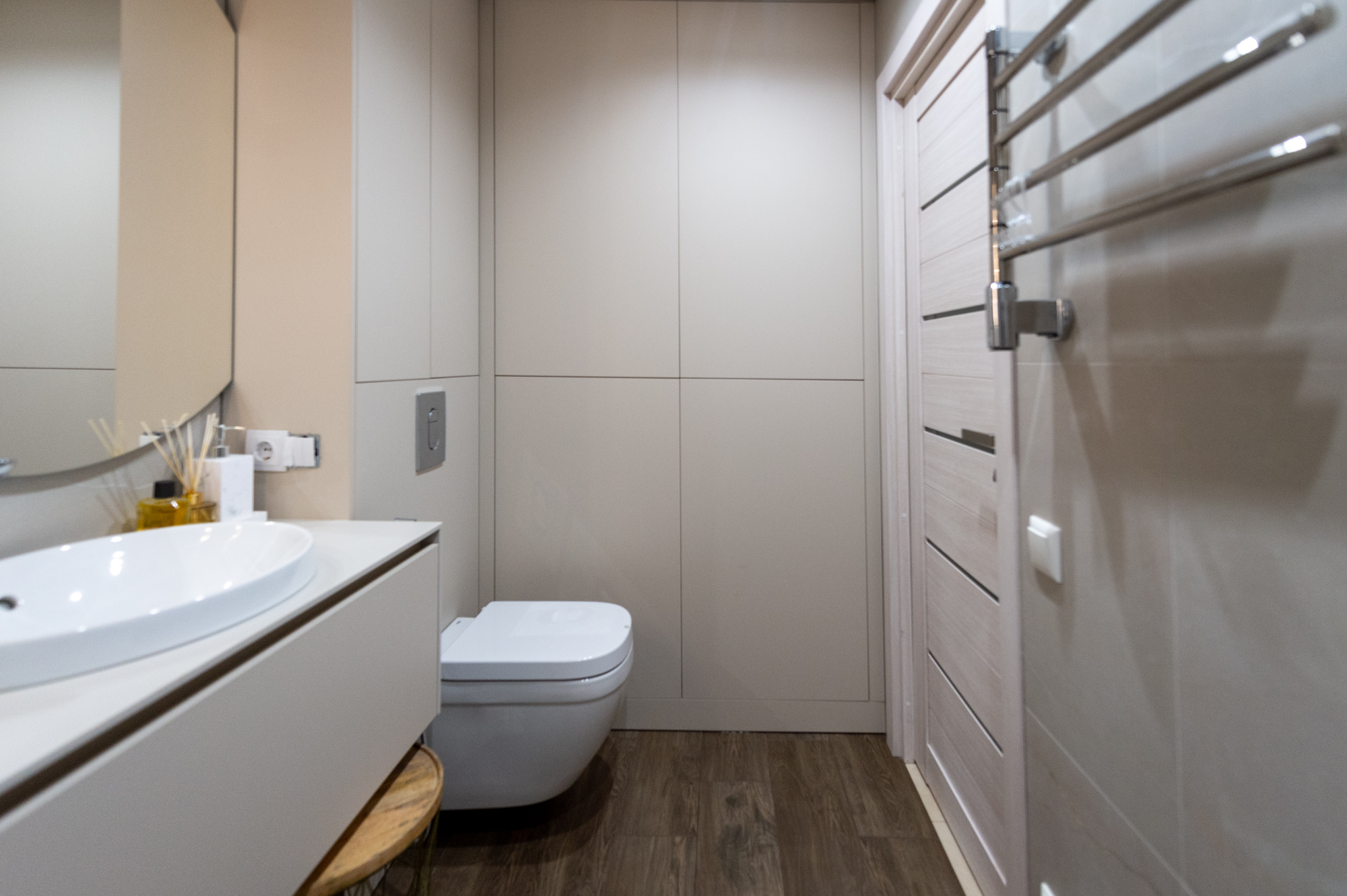 Выполненные работы: эскизный дизайн-проект квартиры, изготовление и установка мебели для ванной комнаты.